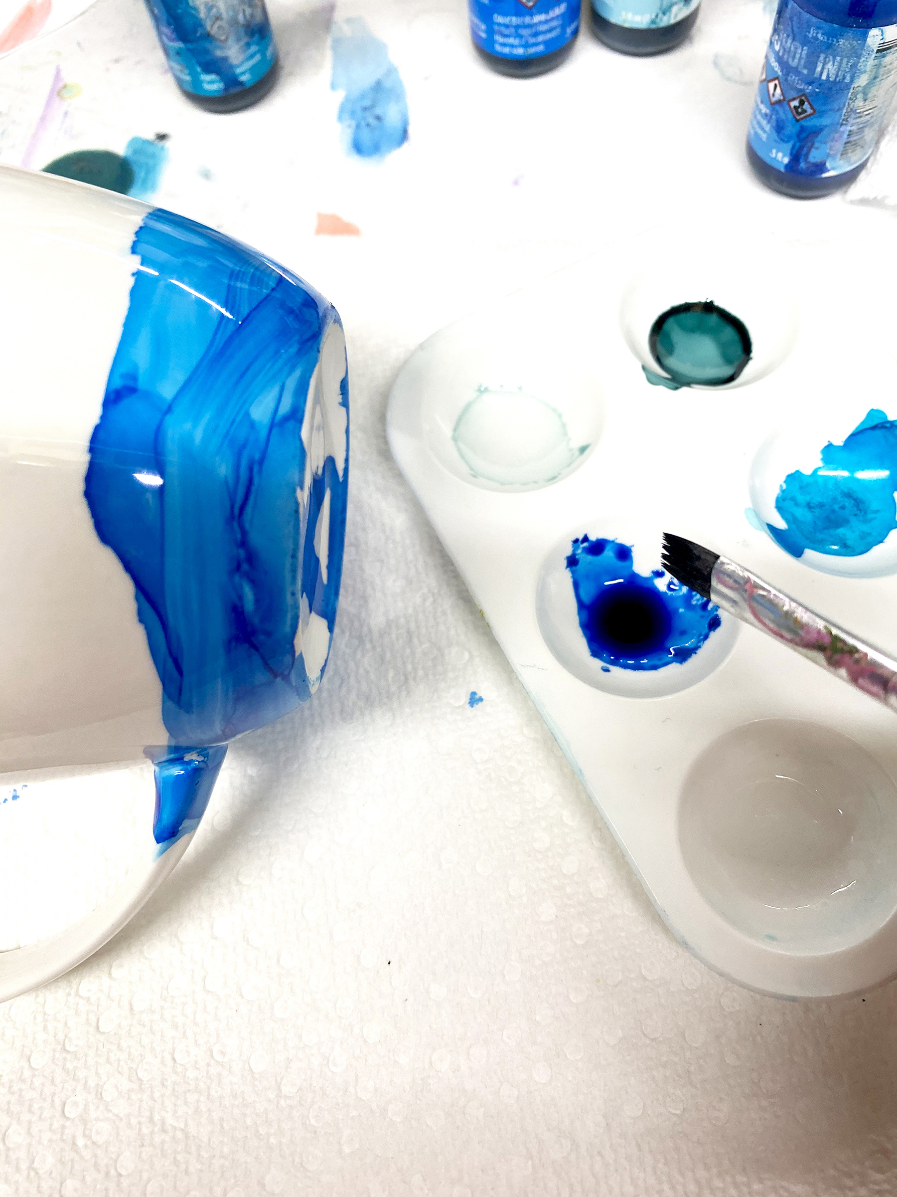 If your not happy with what you have done your can either wipe it off with alcohol or use a small brush with some alcohol on it and push the ink around.  The best way to do this is to use your small dish or lid put a few drops of ink into it, add a drop of alcohol on paint on your mug until you get a look you like.