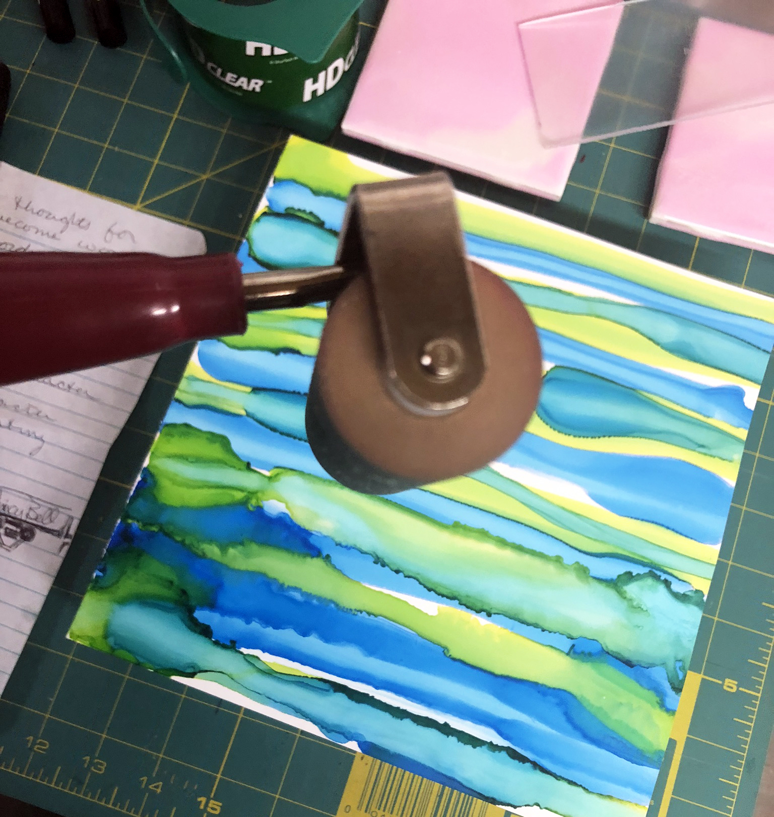 The next step is to create your art pieces, here’s where you get creative. For those of you who have used alcohol ink before, you can skip this part if you want. For those who haven’t, you simply drop some of that ink on your Yupo paper and then spread it out using a brush ( there are several different ones with cut outs in them. I have used many different items to spread the ink around use your imagination and experiment. You can also drop some alcohol onto the ink and blow it around with an embossing gun (mini heat gun), a straw or simply blow on it. You can drop some alcohol and tilt your paper and let it run. Using several colors can create some interesting effects. Make several different designs but in colors that will compliment each other once they are mounted.