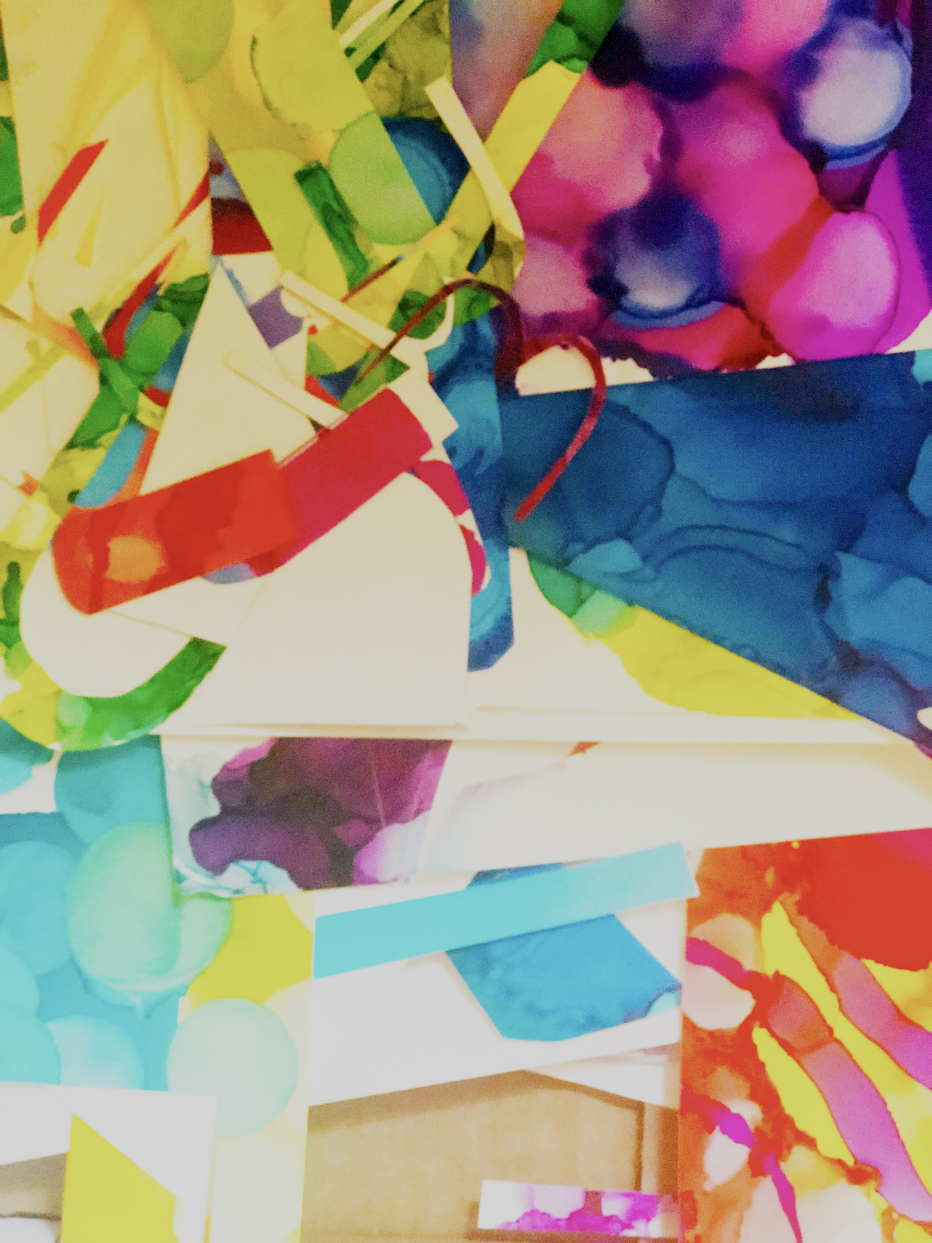 The next step is to layer your panel with other pieces you have created with your alcohol ink. I have a box filled with scraps I can choose from. Cut them into any shape and then use spray adhesive to mount them to your board. Try not to do too much overlapping, I have found that if I do this my project will then require multiple layers of resin.