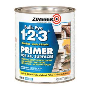 - Zinsser Bullseye 1-2-3Â is a water based Primer/Sealer does not require sanding, however scuffing up shiny surfaces will help with adhesion. Â Any waxes will have to be removed before applying also. Not recommended for sealing knots. Â Soap and water clean up. Mold and Mildew resistant. Comes in a spray also.