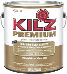 - Kilz Premium is water based and is a Sealer and Stain blocker with a high degree of adhesion.  Glossy surfaces will need to be scuffed up a bit.  Seals porous surfaces, hides colors and is mildew resistant.