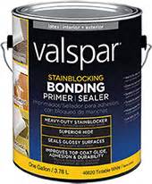 - Valspar Bonding Primer is a newer interior/exterior primer on the market and is terrific at covering colors.  It also seals glossy surfaces, is a stain-blocker, has great adhesion and works on tile, glass, metal, trim and cabinets.  It seals knots and tannin bleed.  It is sandable and tintable.